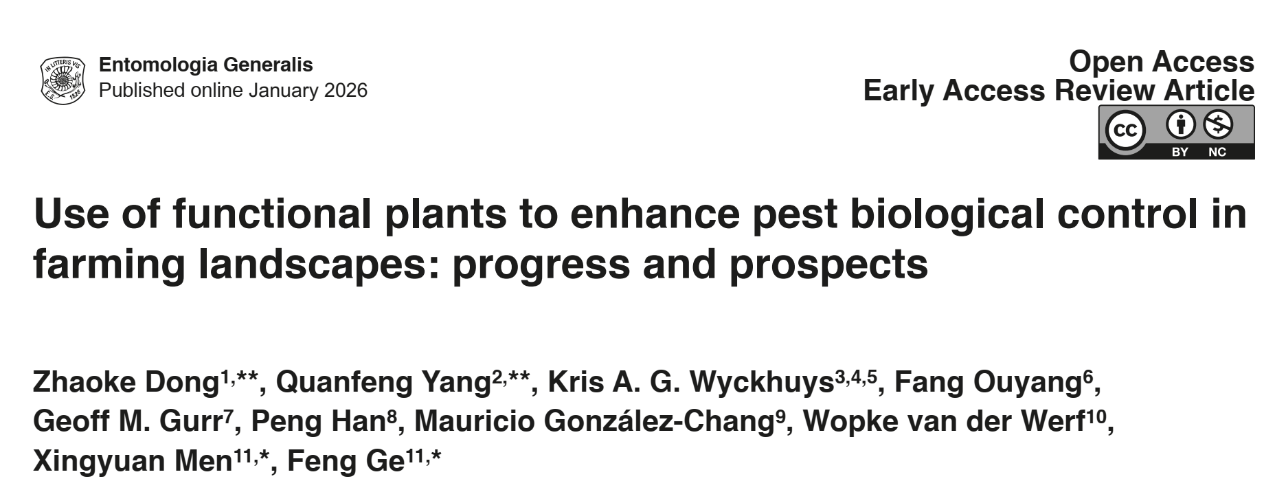 近日,由伟德victor1946网站董兆克副教授联合国内外昆虫生态学专家完成的综述论文《Use of functional plants to enhance pest biological control in farming landscapes: progress and prospects》在国际昆虫学期刊 Entomologia Generalis (一区Top期刊,IF=4.6)上发表。该综述提出并系统阐述了功能植物(functional plants)这一概念,聚焦它们如何通过多种生态机制促进害虫生物防治并服务于更广泛的农业生态系统功能。