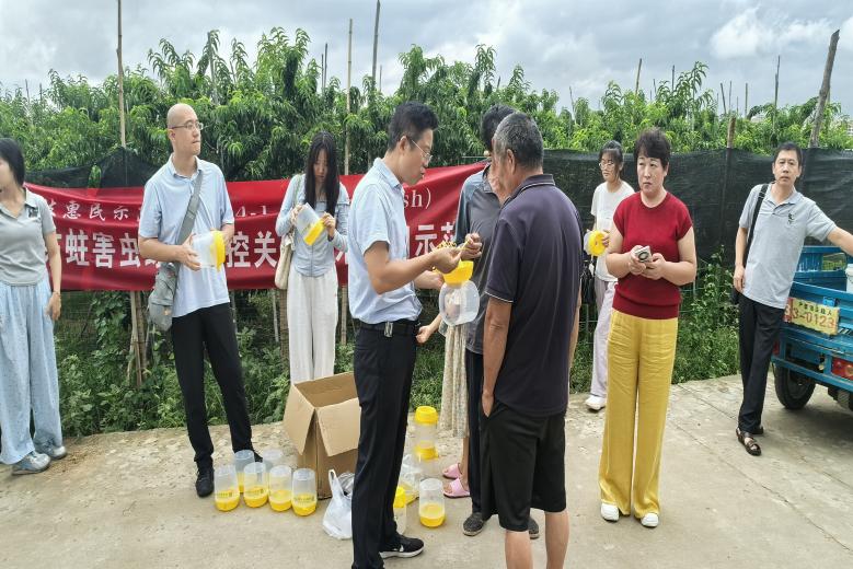 讲解结束后,周洪旭教授又耐心解答了村民在农业生产中遇到的问题,分析了虫害的成因,并给出了一套包括优化果园生态环境以及合理使用生物农药的综合防治方案。随后,他带领团队深入田间查看果树种植及害虫发生情况,向村民们发放了黄板、双性引诱剂及诱捕器,示范并协助村民对新入侵水果钻蛀害虫进行绿色防控。此次技术培训与田间示范活动是伟德victor1946网站果树害虫成灾机制与绿色防控团队服务乡村振兴的具体举措。通过深入乡村,将理论知识与实践相结合,为村民提供实用的农业技术支持,不仅提升了员工们的专业素养和社会责任感,还为西石沟村的果业发展注入了新的活力。