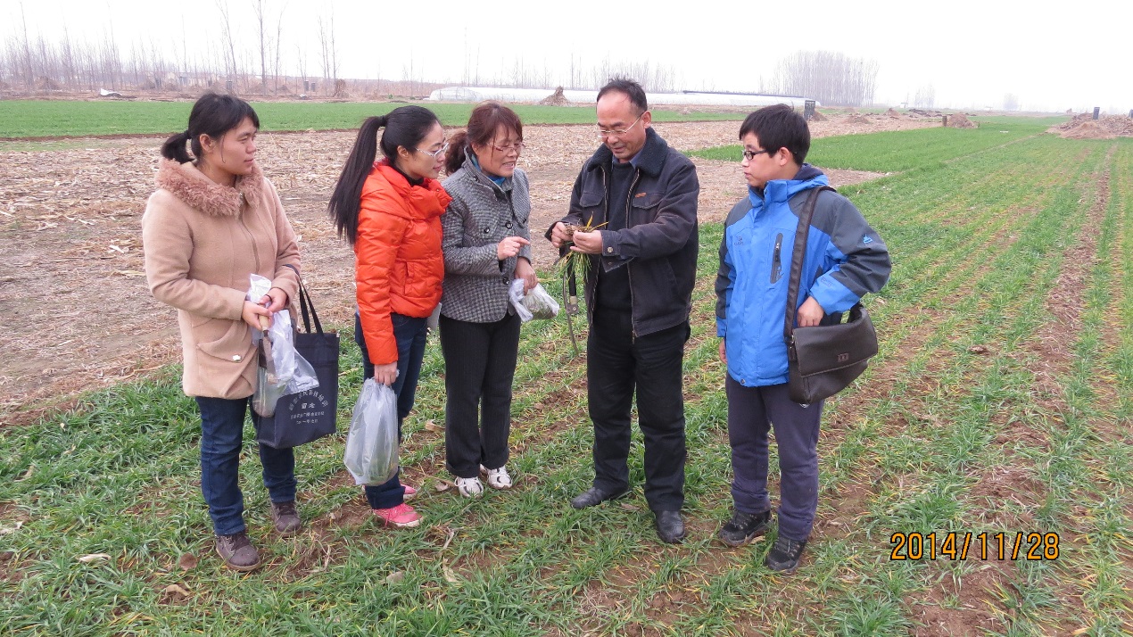 赵洪海教授多年来主要从事小麦和大豆孢囊线虫、蔬菜和果树根结线虫等重要作物线虫病害的研究,多次为青岛等地基层技术人员和农民培训病害防控和绿色植保知识。图为2014年11月,赵洪海教授应莒县植保站邀请进行小麦病害调查,指导小麦孢囊线虫病害的田间诊断。