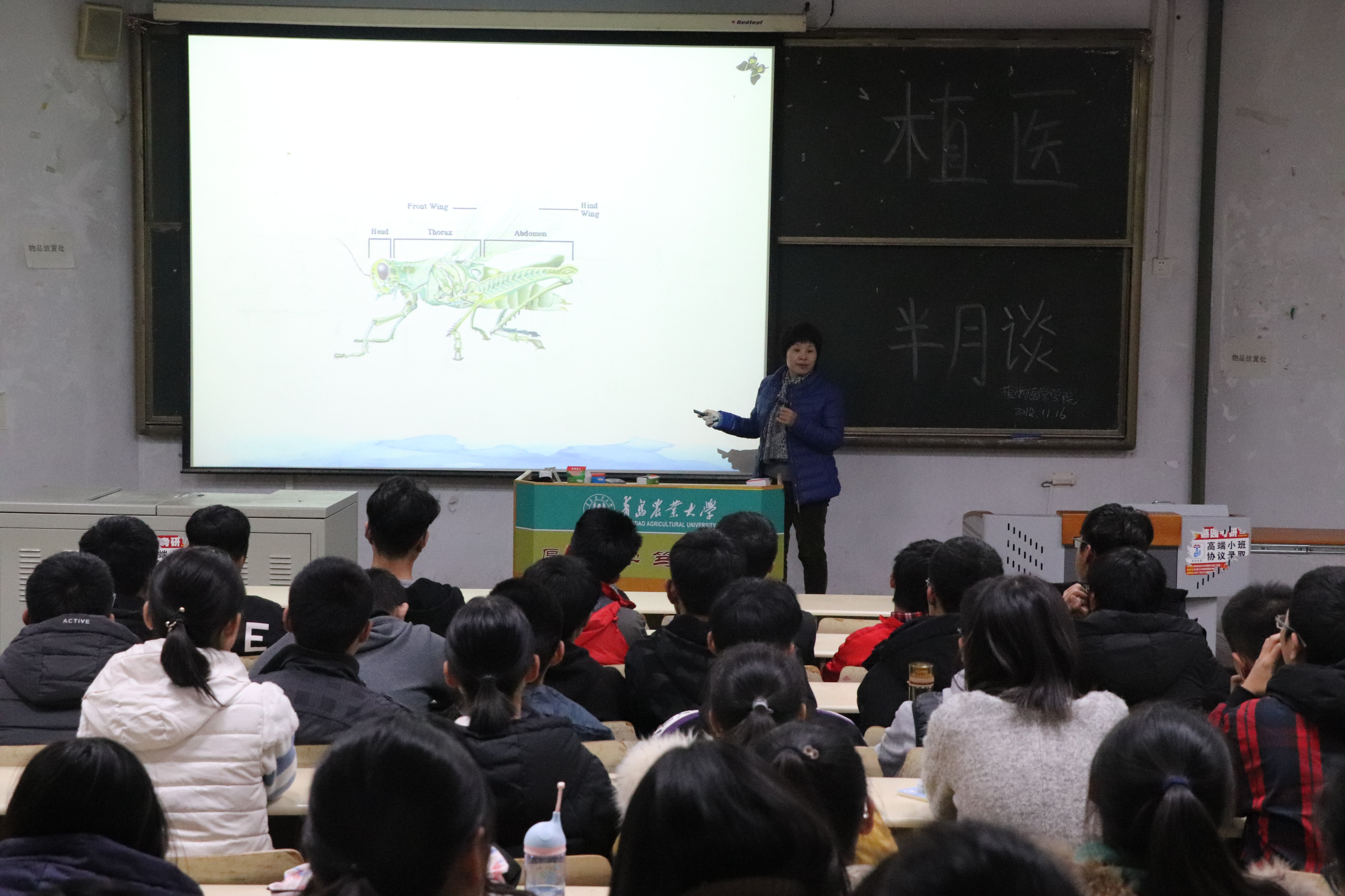 郑桂玲老师结合自身研究方向给同学们上了一堂生动的昆虫课。她指出,昆虫的种类、数量庞大,只有充分了解各类昆虫的习性才能更好的对昆虫加以防治、利用。她还指出,昆虫与人类关系密切,防治害虫可以预防疾病流行,合理利用益虫能为人类生活创造收益。