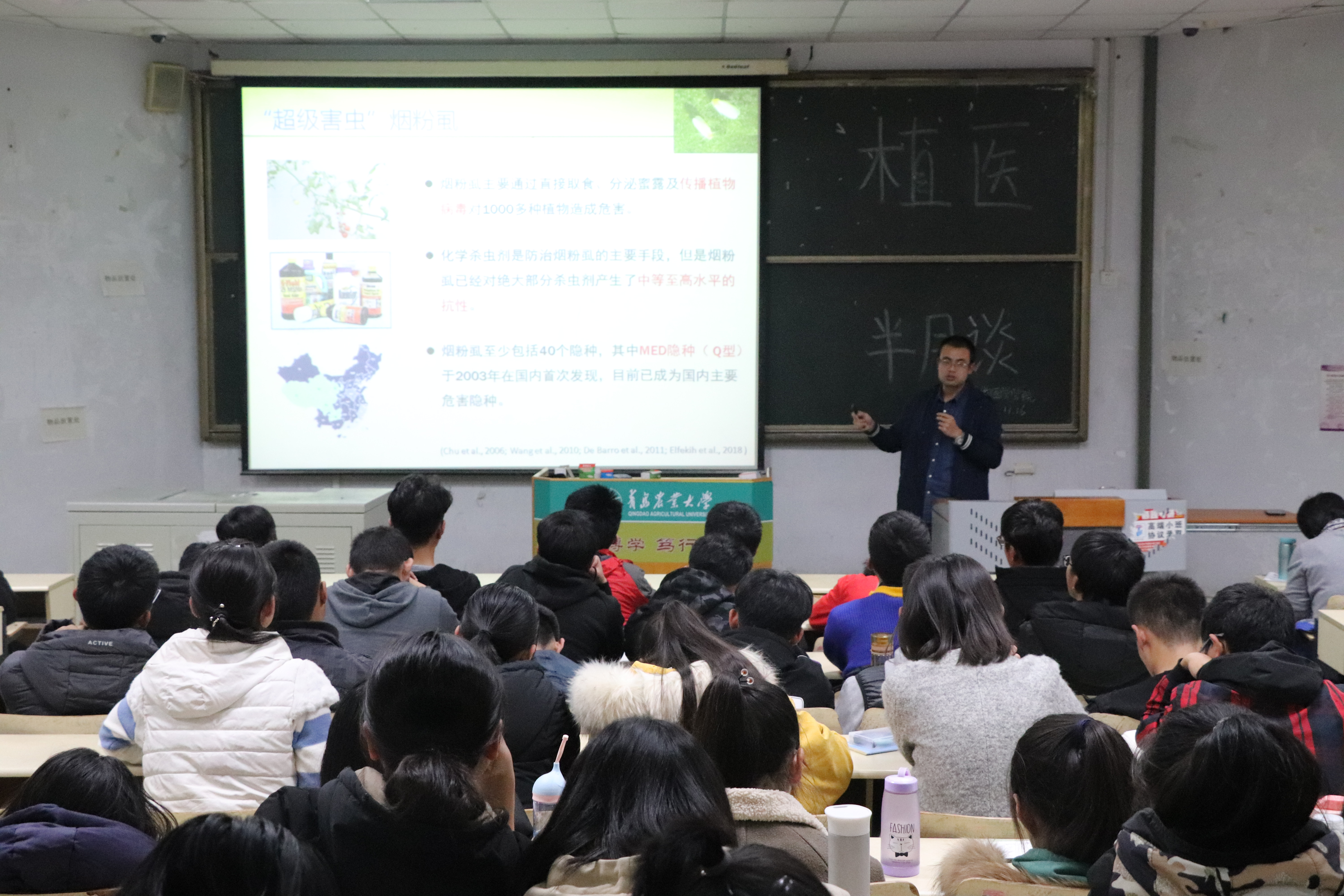 郭磊老师的研究植物化学保护,植物化学保护是利用化学方法进行农药加工,进而研究农药对靶标作物、非靶标生物、环境和有害生物中的影响。他结合自己做过的烟粉虱实验,向同学们介绍了有害昆虫会对毒力产生抗药性。