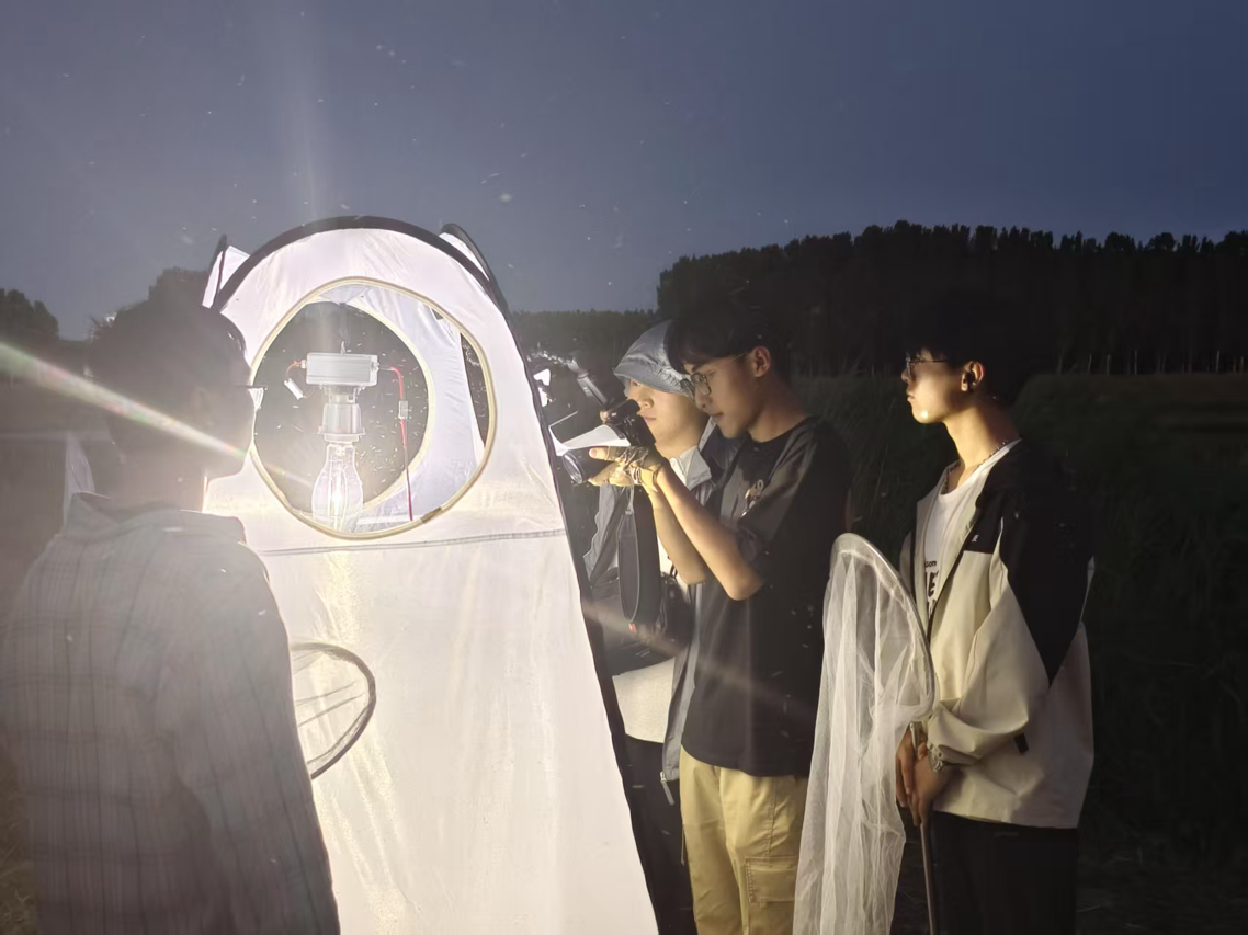 活动现场,同学们学习昆虫分类和昆虫标本制作理论知识,制作昆虫标本,从软化、整姿、干燥、防腐、装裱多道工序,将昆虫的鲜活肌理与斑斓体色永久封存在玻璃标本盒里,让生命之美对抗时光褪色。夜幕降临时,同学们点亮光源,静候蛾类赴约,细致记录月下振翅轨迹。