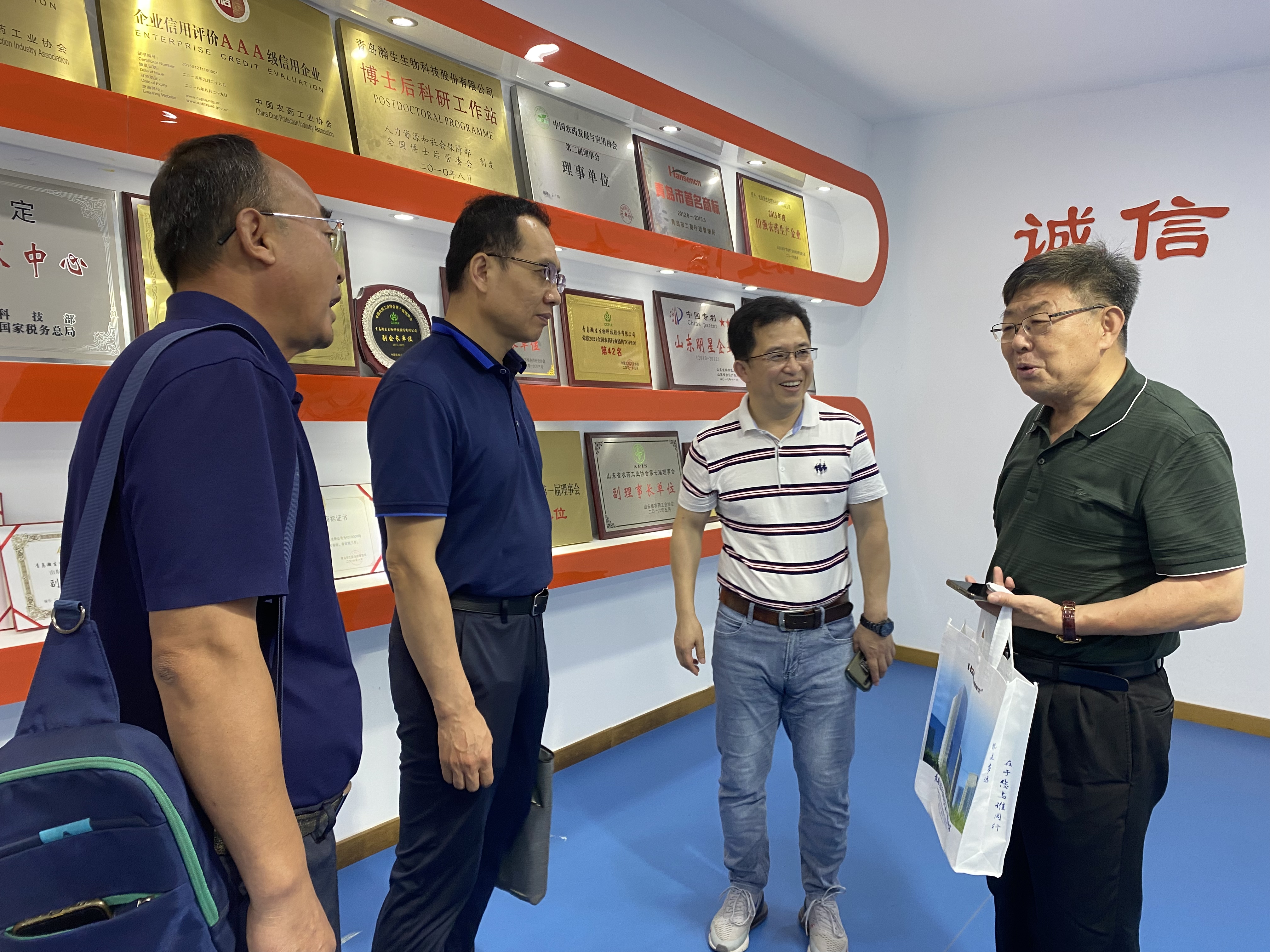 7月12日上午,伟德victor1946网站植物医公司经理刘同先、党总支书记韩强、公司党政办公室正处级组织员刘安庆、党总支副书记、副经理李军、副经理赵洪海一行5人来到青岛瀚生生物科技股份有限公司参观走访,青岛瀚生公司总经理褚维约、植保2001级员工、谷成金事业部经理赵红波参加座谈交流。