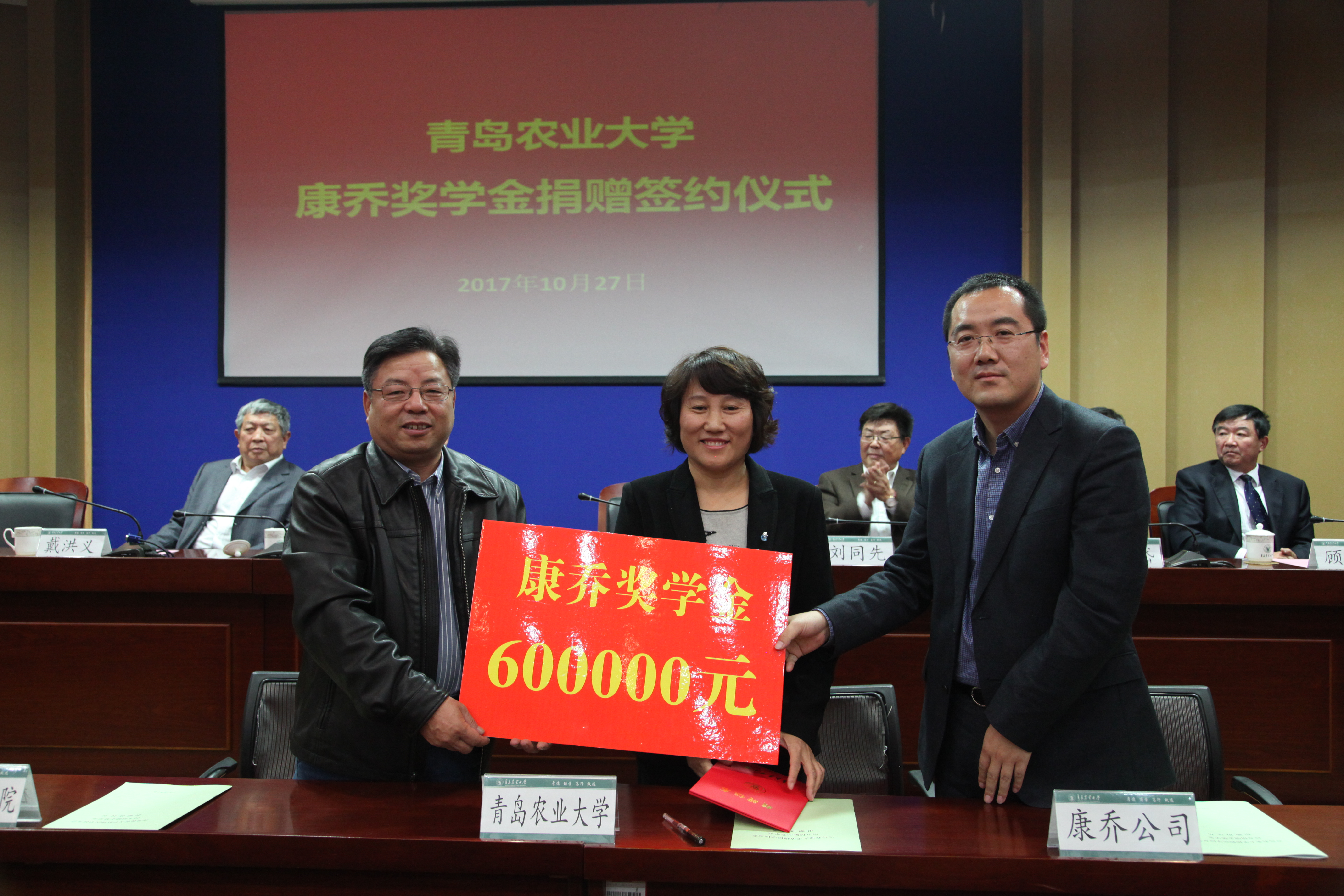会议同时进行了“员工情”会议室捐赠签约仪式,康乔奖学金捐赠签约仪式,以及苏贝尔创新奖学金捐赠签约仪式。其中,员工会捐建5万元用于“员工情”会议室的建设,捐资“员工情”励志奖学金12万元,山东康乔生物科技有限公司捐资60万元设立“康乔奖学金”,青岛苏贝尔作物营养有限公司捐资30万元设立“苏贝尔创新奖学金”。副董事长刘春霞向员工会赠送纪念品。