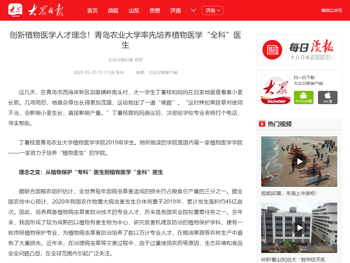 “植物医学专业人才也应像人类医学和动物医学人才那样,在遇到植物健康问题时分析出原因,并提供更加科学的解决方案”。该公司2019届硕士毕业生薛德胜毕业后在青岛当地一家作物营养公司从事技术研发工作,为保证植物健康提供各种产品和技术服务。在他看来,国家倡导对农作物及各类经济作物减药减肥增效的“两减一增”政策,是对作物生长管理认识的一个重要转变。“一棵植物的一生和人类一样,也会遇到各种各样的问题,如何让植物更加健康,需要‘植物医生’队伍的发展壮大和积极作为。”