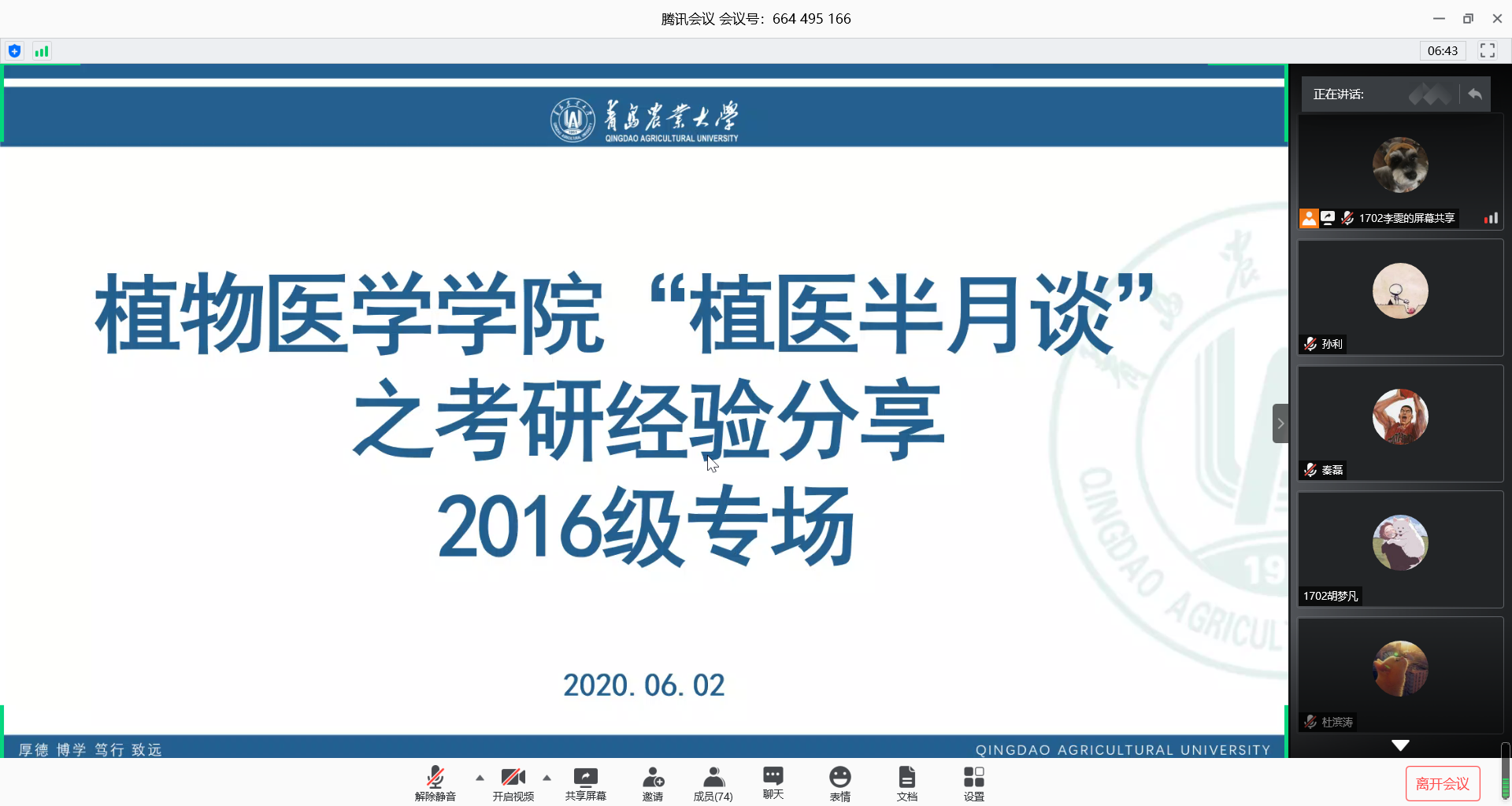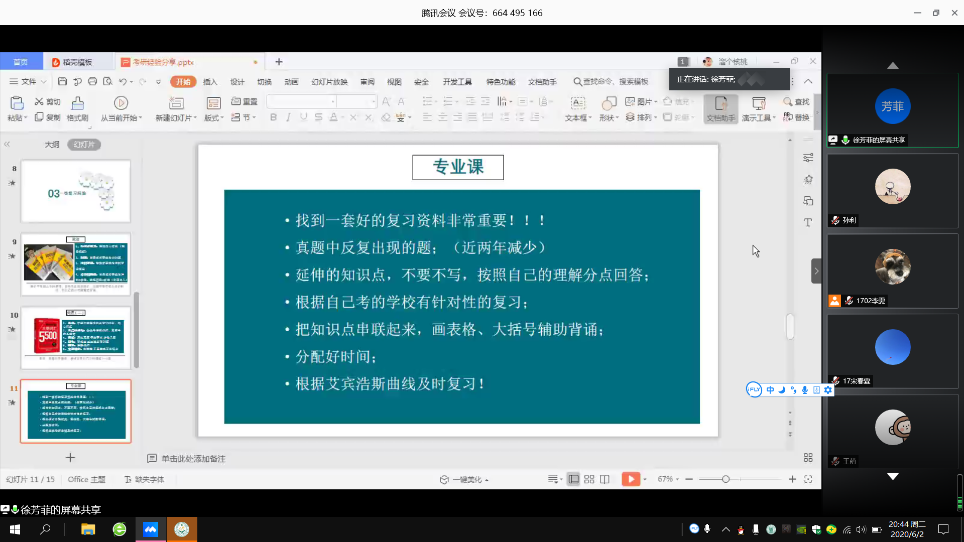 会议开始,丁晨对受邀同学做出介绍并表示欢迎。会上,七位分别从院校选择、备考时间、备考科目、备考计划指导及复习心态调整等五个方面进行详细讲解。彭得智、付璇璇向与会同学分享了中国农业大学考研相关经验,建议合理安排时间并严格执行,浙江大学马文婧全面详细的分享了考研复习资料及相关网课建议大家寻找“研友”,共同进步,刘紫菱分享了西北农林科技大学的考研初试复习经验,并就学习方法提出多项建议。管昌胜分享了南京农业大学的考研复习经验,强调英语的重要性。华中农业大学徐芳菲、杜滨涛分享了华中农业大学考研经验,并建议在场同学们根据兴趣报考专业。会议期间,七位同学分别结合自身经历,分享备考经验,从确定目标院校到备考时间的合理安排,尤其就考研复习资料的选择和重点复习内容进行了耐心细致的讲解,并强调劳逸结合、提高效率的重要性,令人受益匪浅。