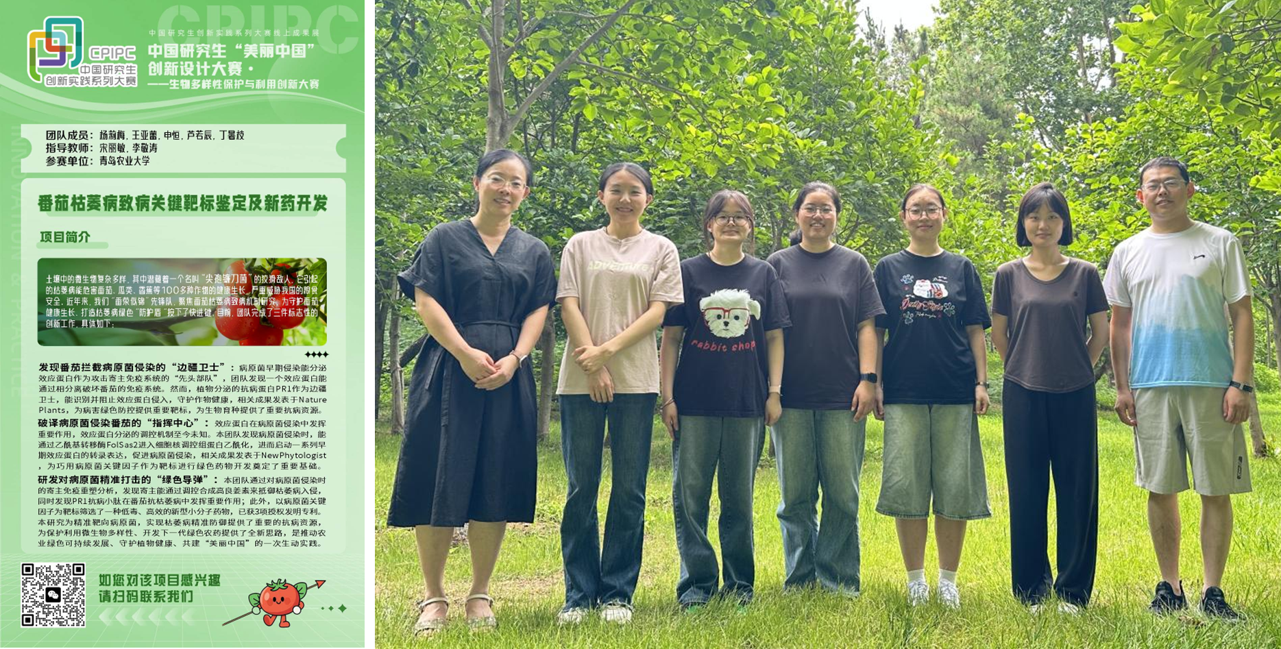 2025年9月20日至22日,中国研究生“美丽中国”创新设计大赛—生物多样性保护与利用创新大赛全国总决赛在杭州浙江农林大学举行。伟德victor1946网站“番荣似锦”先锋队(团队成员:杨莉梅、王亚蕾、申恒、芦若辰、丁暑枝;指导教师:宋丽敏、李敬涛)凭借项目《番茄枯萎病致病关键靶标鉴定及新药开发》荣获全国二等奖,展现了公司在植物病害绿色防控与生物多样性保护方面的科研实力与创新水平。