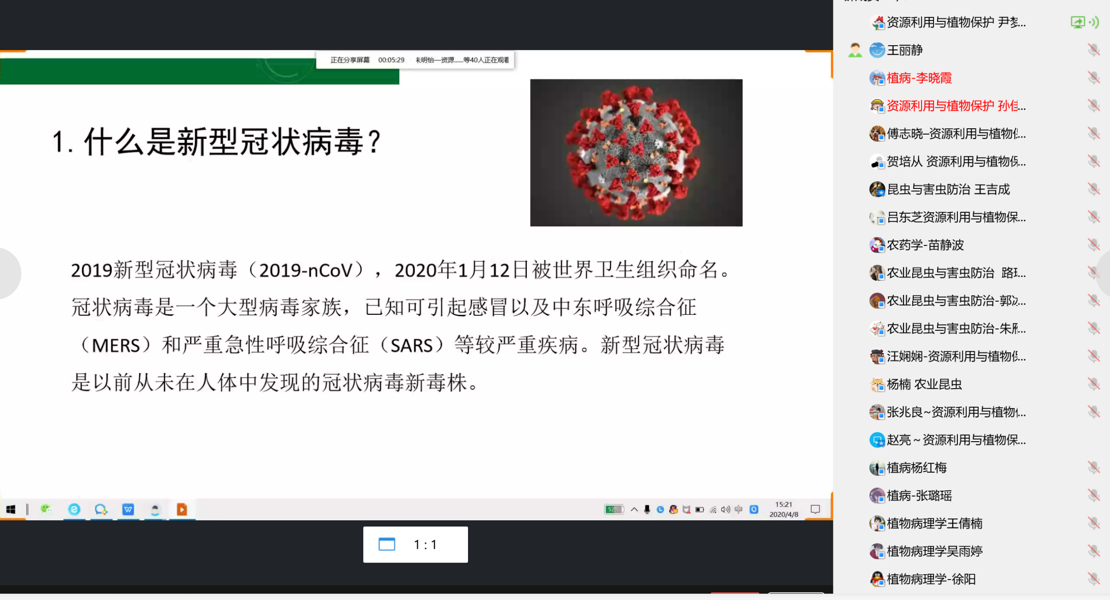4月8日,伟德victor1946网站举行研究生疫情预防主题班会,通过QQ语音屏幕共享的形式开展,2017、2018、2019级研究生分批次进行,员工党员李江杰、孙慧琳、尹梦婕担任主讲,公司团委书记、研究生辅导员王丽静参加。