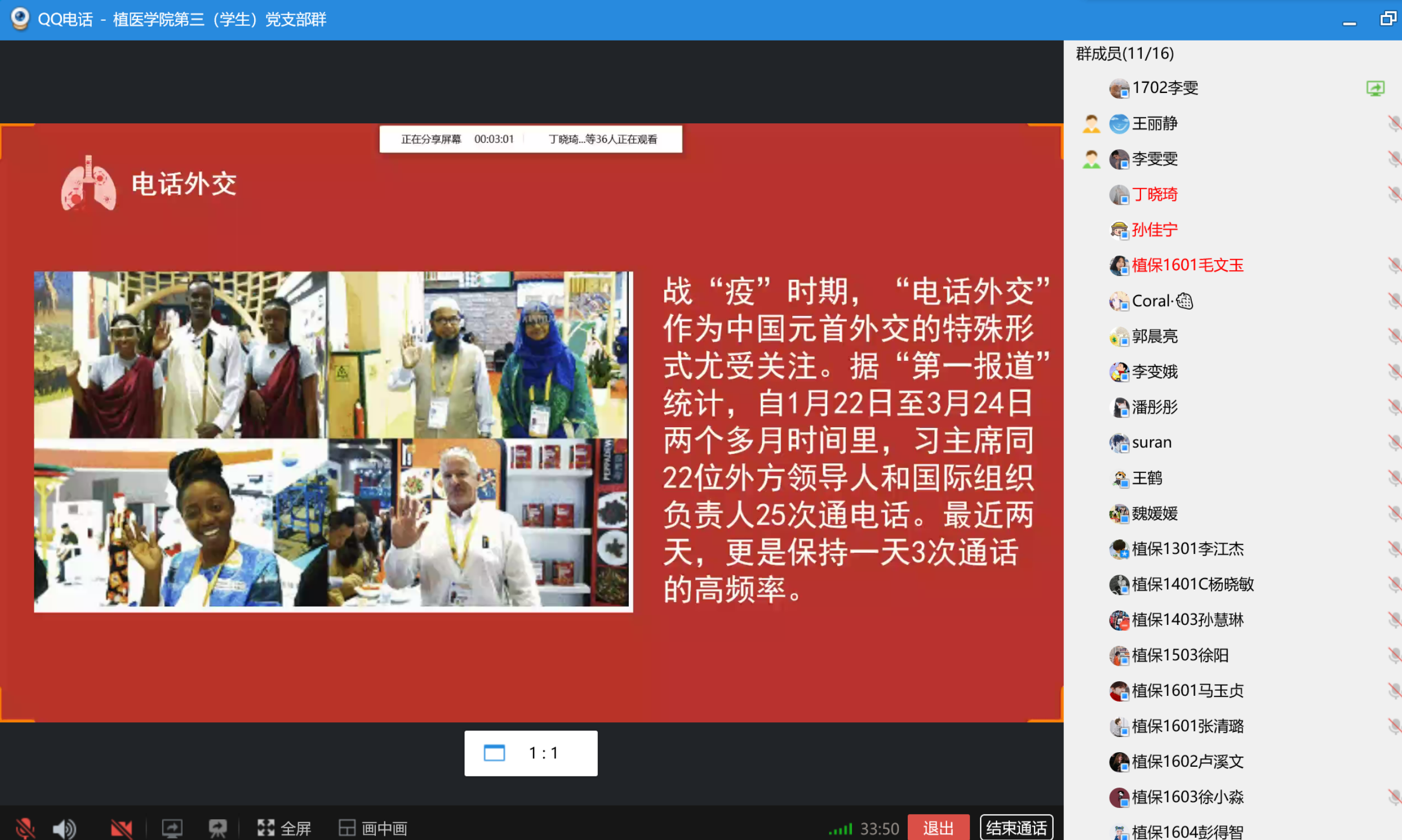 随后,员工党员李雯同志为大家讲述了这场国际战役的中国温度。疫情发生以来,中国始终秉持人类命运共同体理念,本着公开透明和负责任的态度及时发布疫情信息、分享经验、开展合作,中国政府已经宣布向82个国家和世界卫生组织、非盟提供援助,包括检测试剂、口罩、防护服等,其中多批援助物资已经送达受援方。全球战疫期间,习近平总书记频繁同外国元首、政府首脑以及国际和地区组织负责人交流,介绍中国经验、传递必胜信心。特别是疫情在全球多点暴发后,习近平总书记在外交辞令中经常用到“患难见真情”“阳光总在风雨后”“铁杆情谊”“感同身受”这样的暖心话语,表达中方的关心支持,传递同舟共济、携手抗疫的坚定信念。