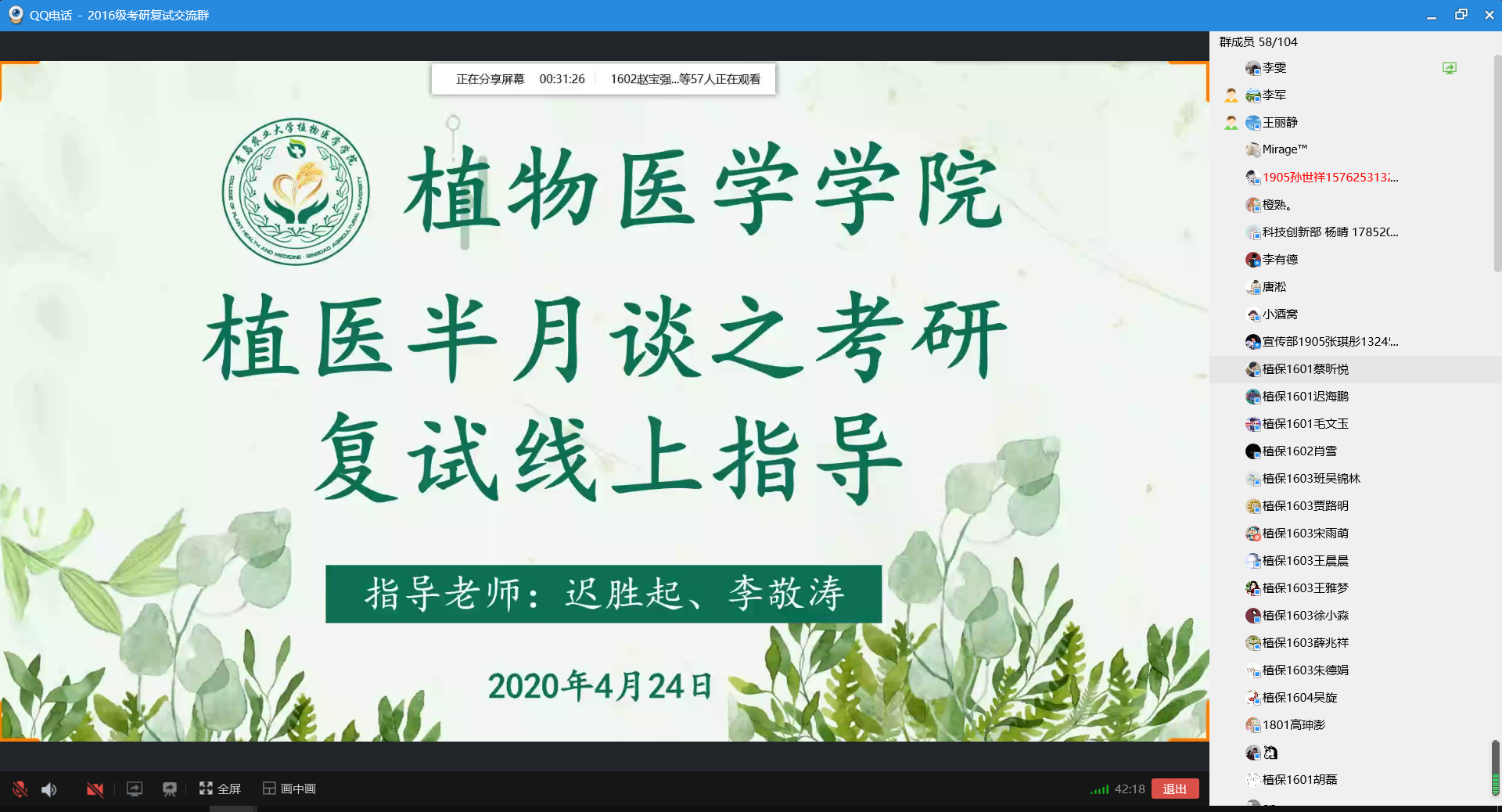 植医半月谈之考研复试、就业指导会:为做好2020届毕业生考研就业工作,公司多次开展考研复试指导会、就业推进会,邀请公司专业教师迟胜起、李敬涛和2019届、2018届毕业生开展考研复试经验交流会,邀请企业优秀员工代表徐燕,杨铭鑫等人开展就业指导经验交流会,公司植医半月谈考研就业指导系列活动的开展,真正将毕业生考研就业工作落到了实处。